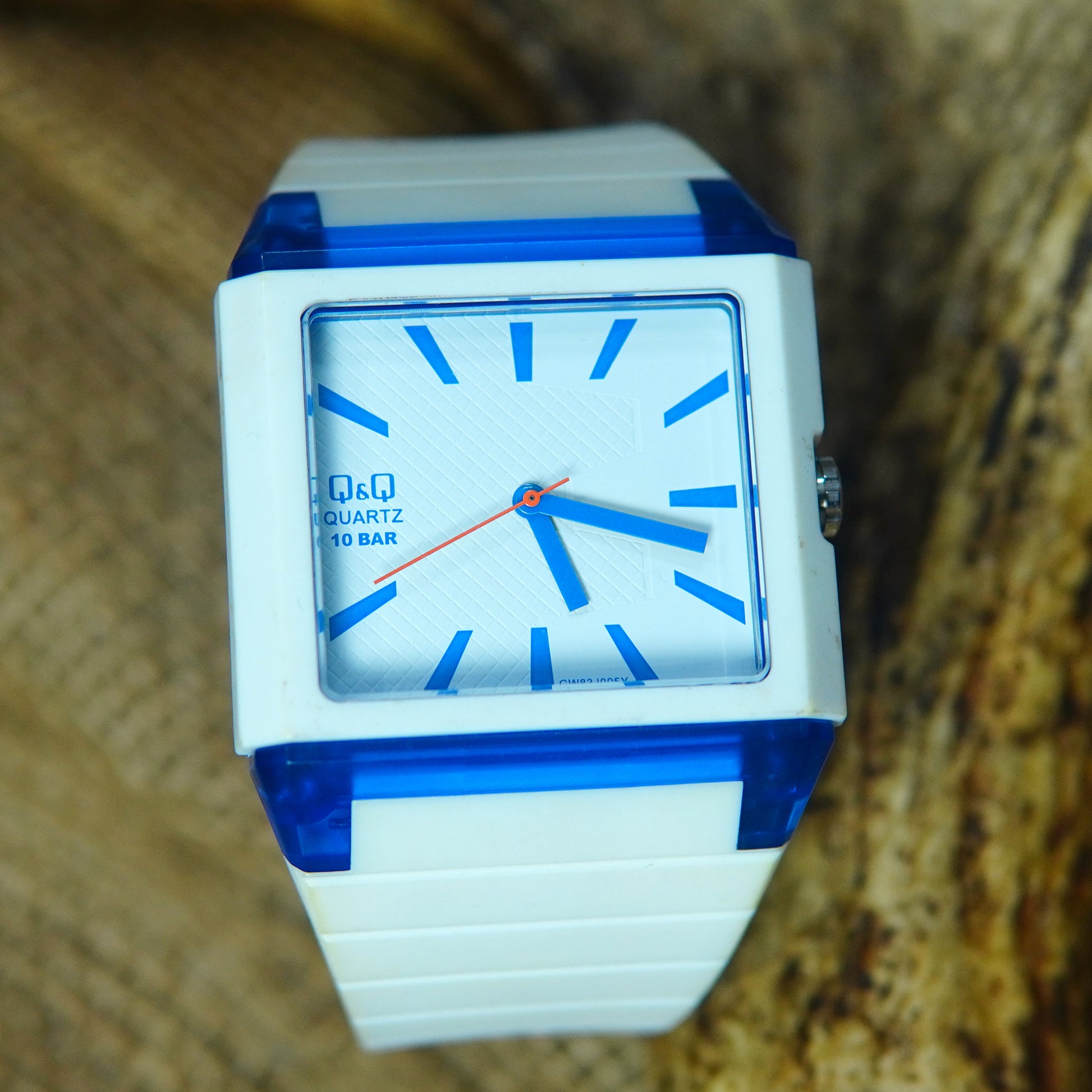 Hands: Blue with orange second hand